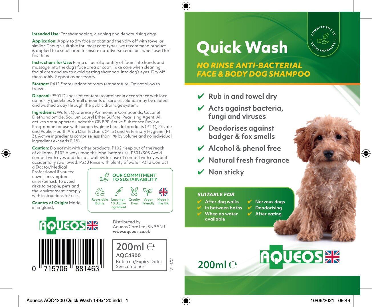 Quick Wash is a no rinse anti-viral, anti-bacterial and anti-fungal foam dog shampoo.