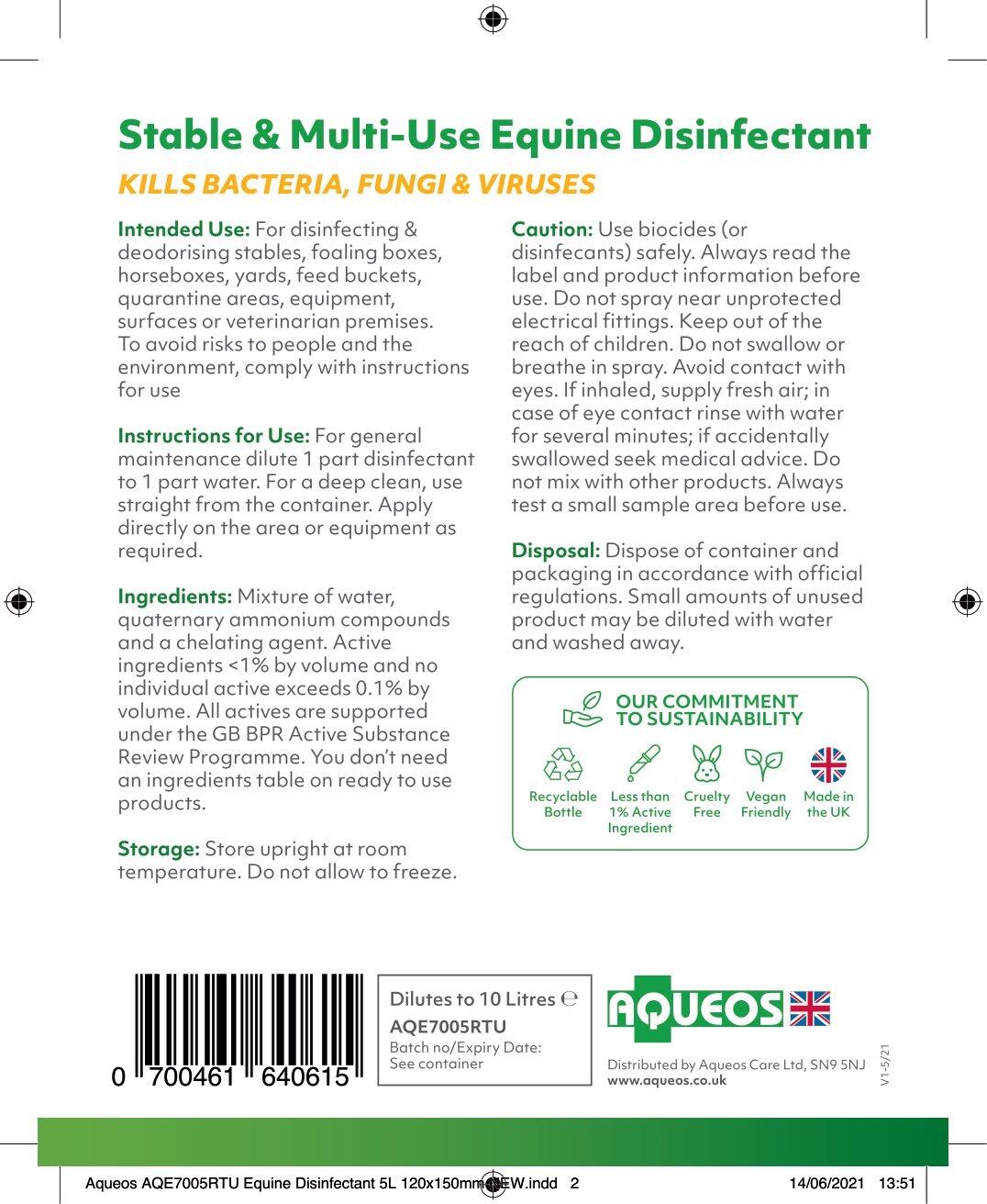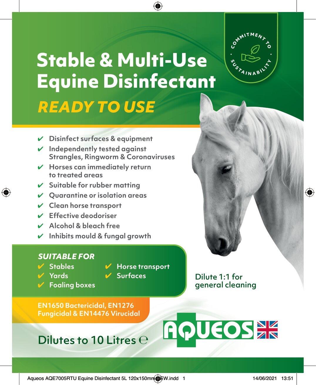 Aqueos equine disinfectant helps with bio-security, giving equestrians and professionals peace of mind. The disinfectant kills 99.999% of viruses, bacteria and fungi and there is no need to rinse after application. Horses and people can return to treated areas immediately. Being alcohol free there is less evaporation so the disinfectant is more effective.