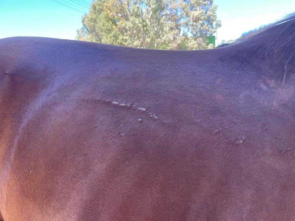 Unfortunately, now that Sundance has developed into a fully-fledged hoolie, this also means battle scars, and this week, when I brought my spirited pride-and-joy in from the paddock, I was dismayed to find an inch-long gash in his shoulder and a scrape along most of the right flank. In the fading light, Sundance looked like he’d come second in a knife fight and frantic calls were immediately made as my friend and I tried to ascertain whether this was a wound that might need stitching.